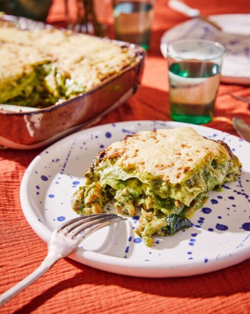 Bak de lasagne 25 minuten in een voorverwarmde oven op 180°C. Serveer onmiddellijk.