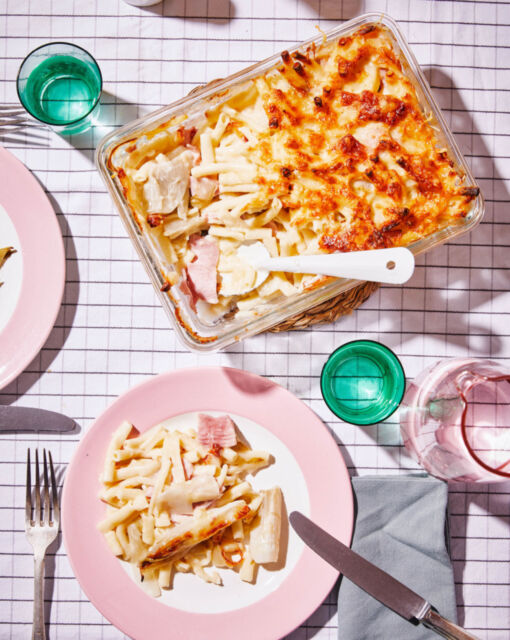 Snijd de ham in reepjes en voeg samen met de voorgekookte macaroni toe aan de saus.