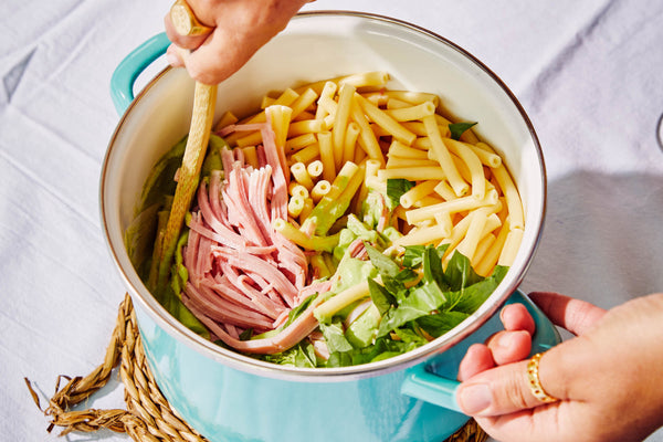 Doe de saus terug in de grote pot en meng het goed met de macaroni. Voeg ook de gesneden ham toe.