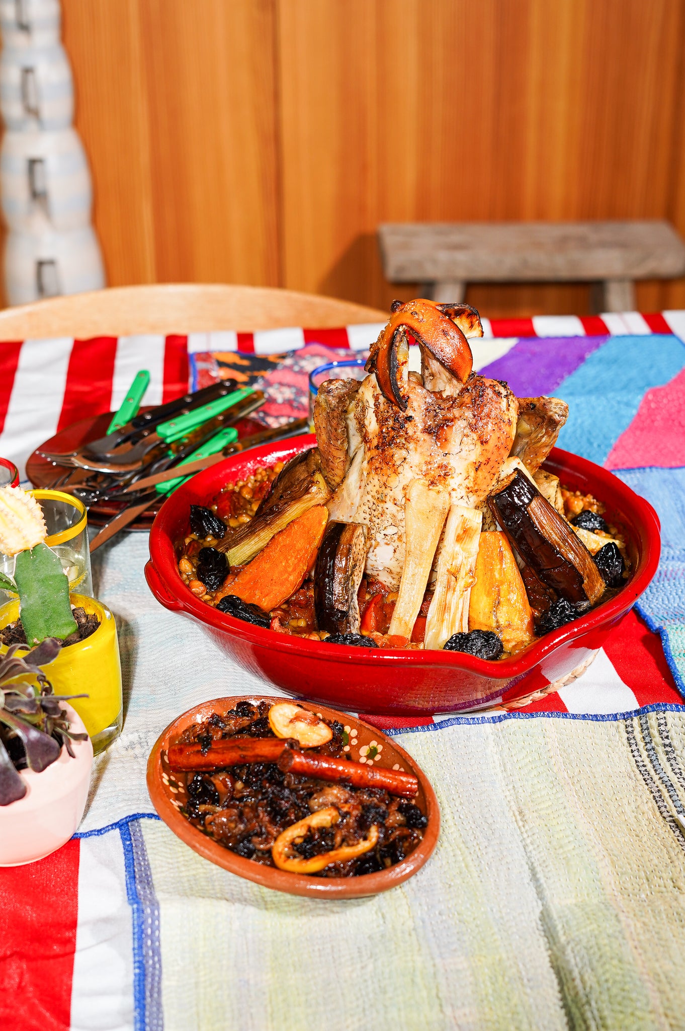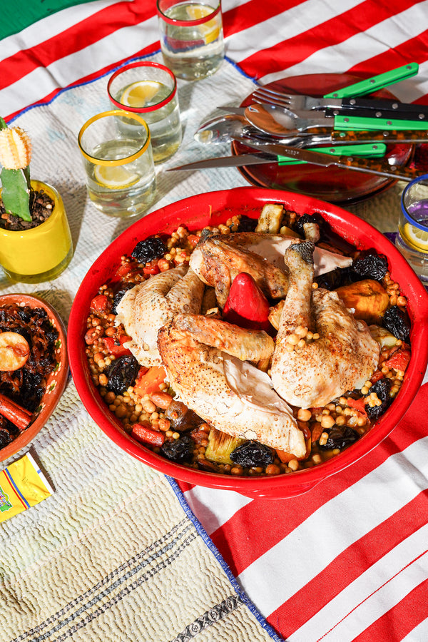Dit gerecht is een ode aan de Marokkaanse keuken met rijke kruiden, sappige kip, geurige parelcouscous en zoetige gekaramelliseerde uien met rozijntjes. Ideaal om te serveren tijdens de ramadan. Alles gaat in deze prachtige handige kippenschotel, recht op tafel. De combinatie van ras el hanout, saffraan, zoete aardappel en gegrilde groenten maakt dit een feestmaal waar je gasten blij van worden. De kippenschaal is trouwens speciaal ontworpen om je kip lekker sappig te houden!