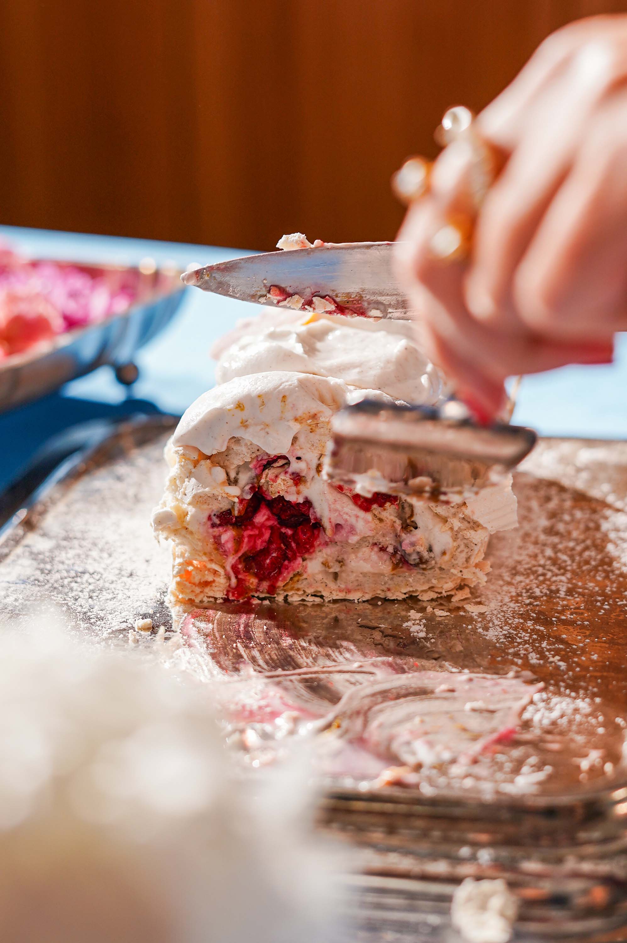Vulling & rollen: Klop de kokosroom met vanillepoeder luchtig op. Spatel het pistachepoeder erdoor. Verdeel de vulling gelijkmatig over de afgekoelde meringueplaat, laat een klein randje vrij aan één korte zijde. Verdeel frambozen en gehakte pistachenootjes over de vulling. Rol strak op vanaf de korte zijde dicht bij jou, met het naadje onder. Zet minstens 4 uur in de koelkast om op te stijven.