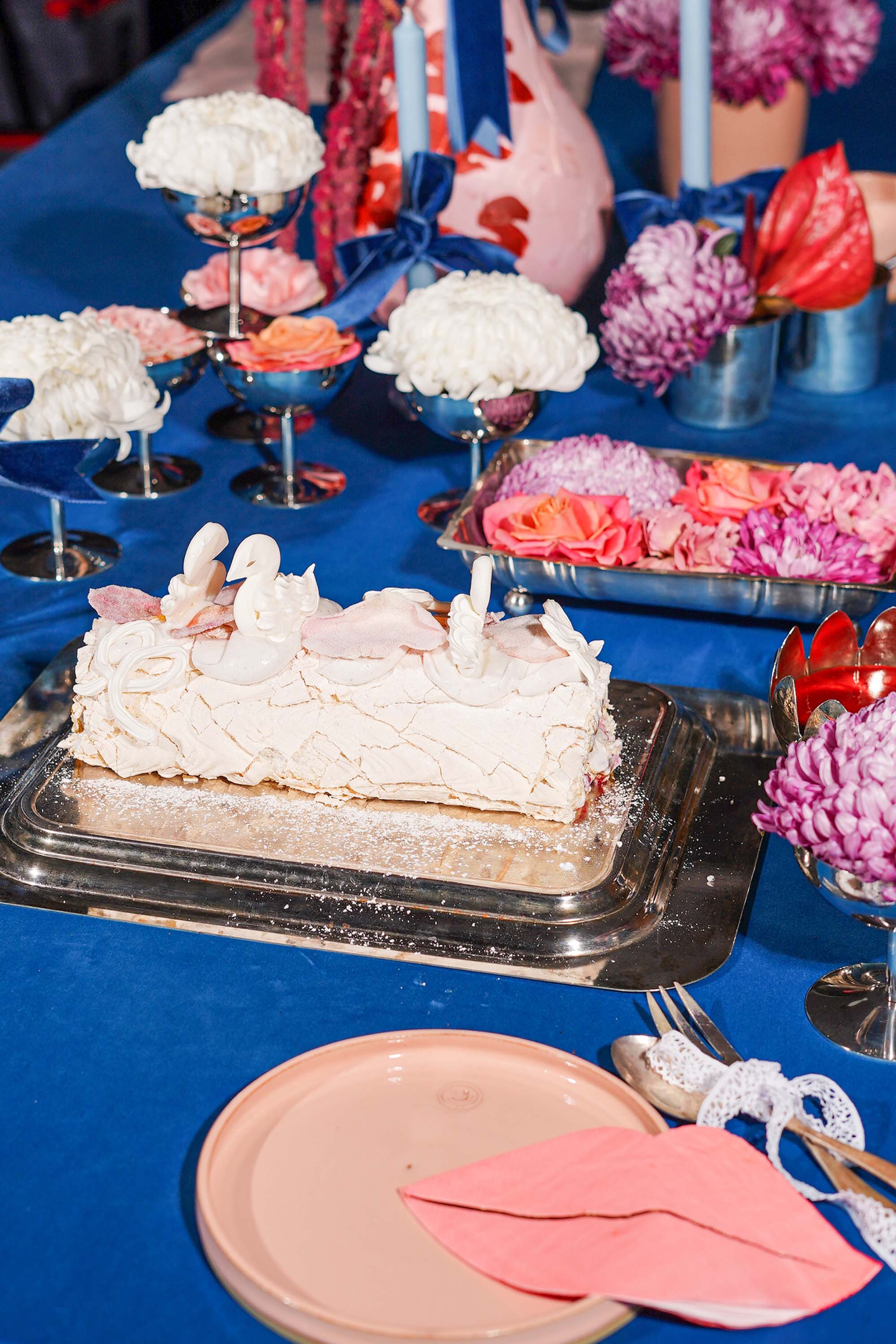 Haal de rol uit de koelkast, maak enkele dotjes van overgebleven kokos‑pistachevulling bovenop. Werk af met gekristalliseerde blaadjes, zwaantjes, sterretjes en strikjes. Bestrooi eventueel met poedersuiker voor sneeuweffect