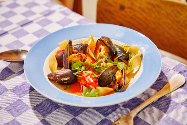 Spoel ondertussen de mosselen, haal de mosselen die stuk zijn of openblijven eruit. Kook de papardelle zoals vermeld op verpakking. Neem deksel van de saus, proef of je eventueel moet bij kruiden en laat nu verder sudderen zodat de saus mooi indikt, want de mosselen gaan bij het garen ook veel heerlijk vocht afgeven. Eens mooi ingedikt voeg je de mosselen toe, roer even goed onder elkaar zodat ze mooi onder de saus zitten en zet deksel erop, laat 3 à 4 min garen of tot ze open zijn.