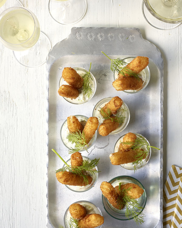 Verdeel de tzatziki over glaasjes, voeg de kroketjes toe, werk af met dille en serveer.