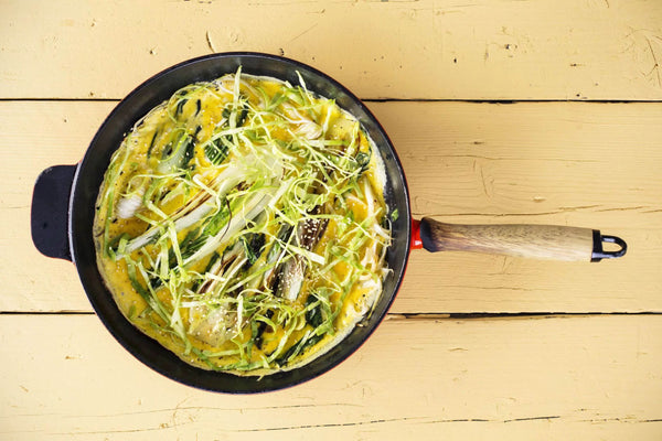 Je kunt de groenlof ook mee bakken met de paksoi, maar ik heb liever iets rauws boven op de omelet voor de ‘beet’. De omelet is echt lekkerder wanneer je verse knoflook gebruikt. Verse knoflook heeft een korte groene uitloper en geen schilferige buitenste velletjes zoals een gedroogde bol knoflook. Het heeft een zachtere smaak en is makkelijker verteerbaar.