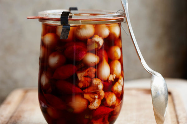Wat heb je nodig?150 g zout 50 g suiker Mengeling van 1 kg bloemkoolroosjes, uitjes, radijsjes, raapjes in vieren gesneden… Weckpot van 1 l, afsluitbaar met een elastiekje 10 ml rodewijnazijn 200 ml mirin of sushiazijn 200 ml gewone azijn