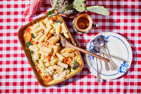 Ovenschotel met scampi, spinazie en pasta in roomsaus