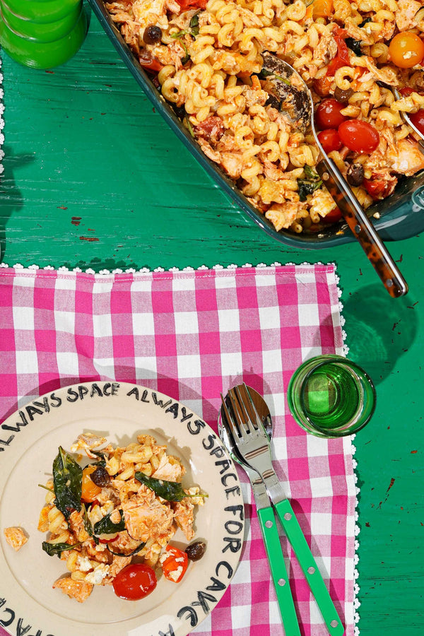 Pasta met feta, zalm en harisa, geconfijte kerstomaatjes en look uit de oven
