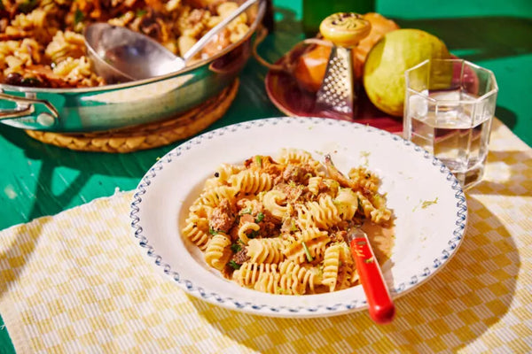 Pasta koken: Breng een grote pan water aan de kook en voeg 10 g zout per liter water toe. Kook de radiatori 1 minuut minder dan aangegeven op de verpakking.