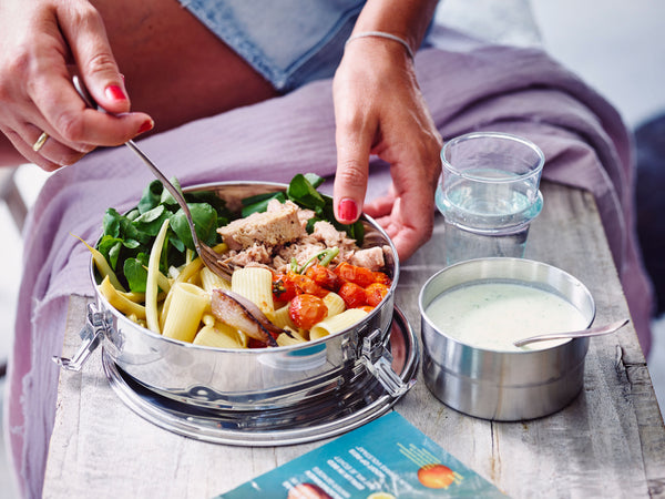 Pasta salade met gepofte tomaatjes, boontjes, tonijn en komkommer-ricotta vinaigrette