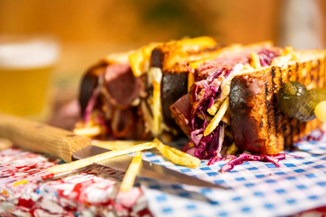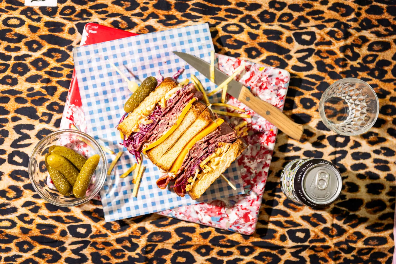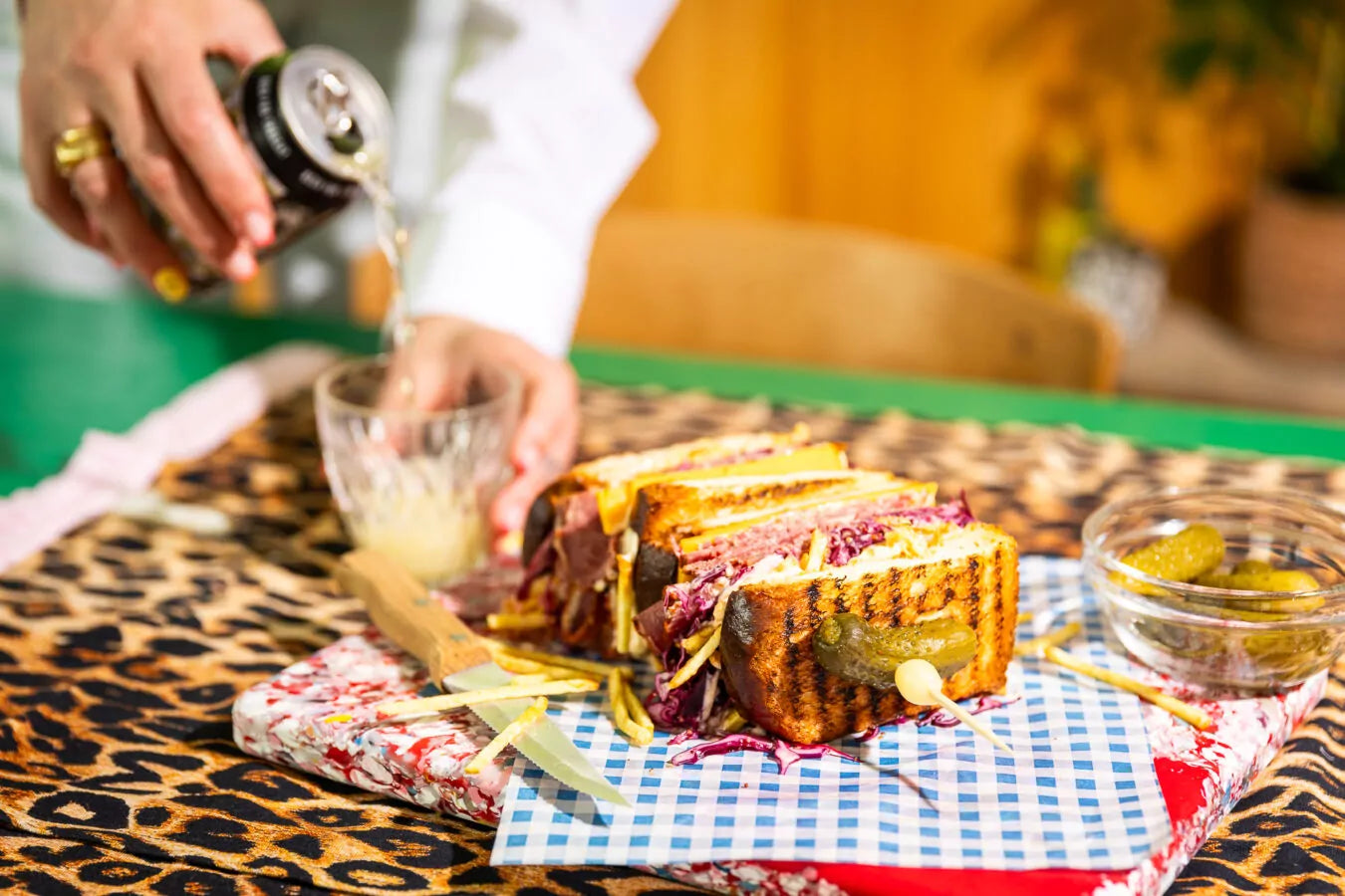 Leg hierop een sneetje cheddar, gevolgd door de gepekelde rodekool, pastrami, frietchips en opnieuw een beetje kimchi-mayonaise.