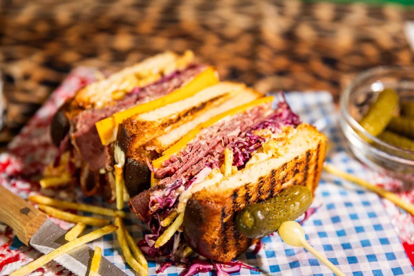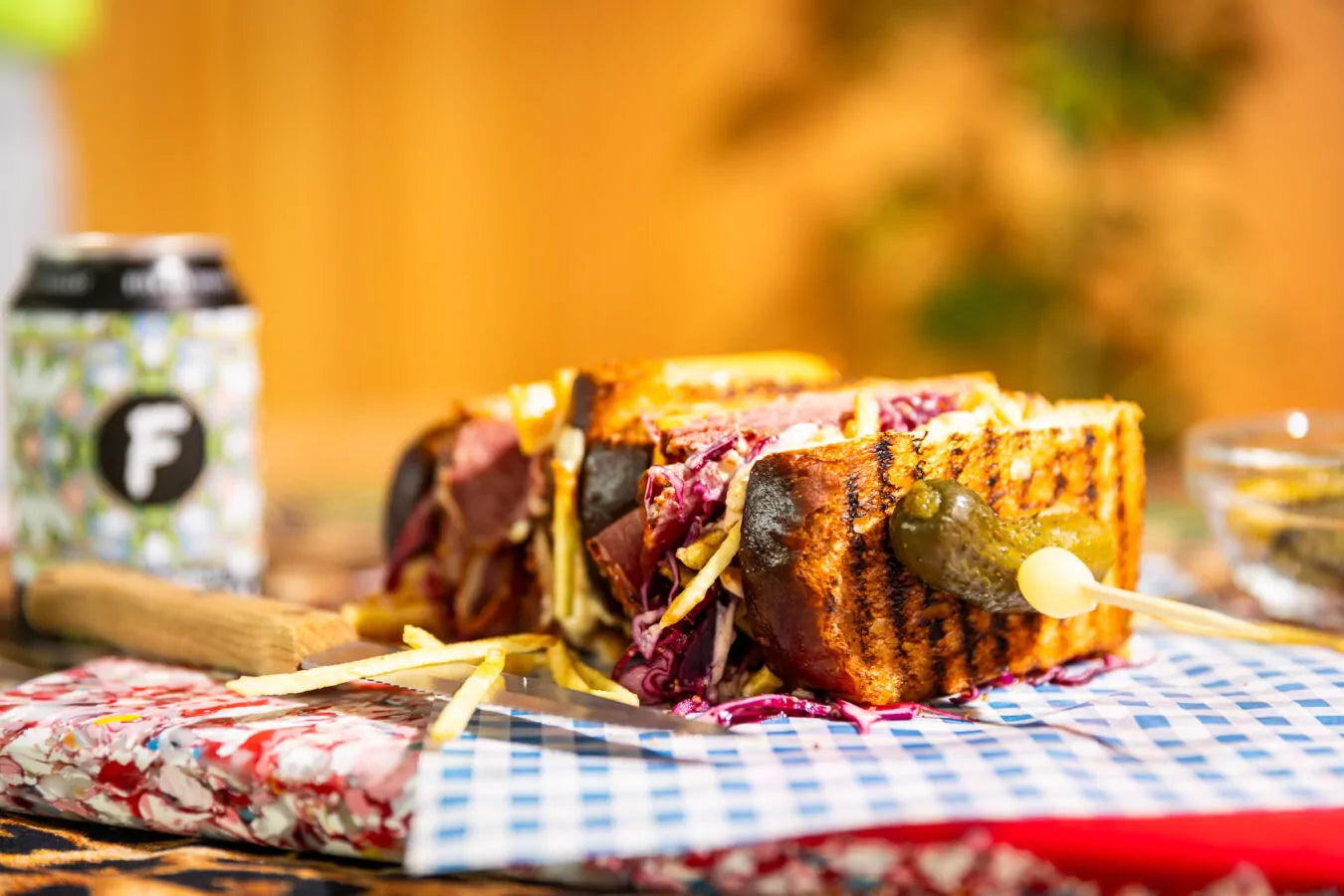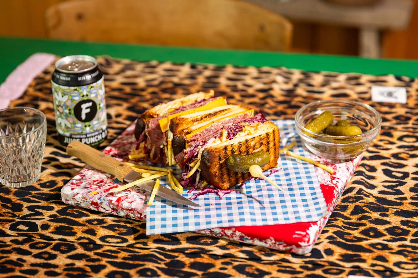 Leg hierop een sneetje cheddar, gevolgd door de gepekelde rodekool, pastrami, frietchips en opnieuw een beetje kimchi-mayonaise.