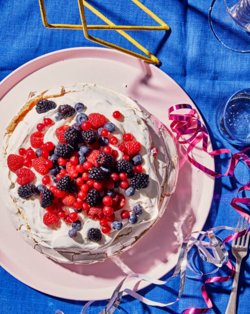 Bak de pavlova twintig minuten op 150 °C en nog eens 40 minuten op 130 °C.