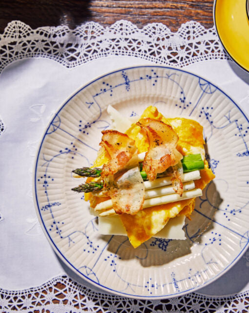 Bak een grote omelet die nog glazig is; ‘baveuse’ heet dat. Verdeel de omelet in vieren en leg de stukken op de pistolets met kaas. Leg daarop de geroosterde asperges met de krokante guanciale en dek af met de ‘hoedjes’ van de pistolets.