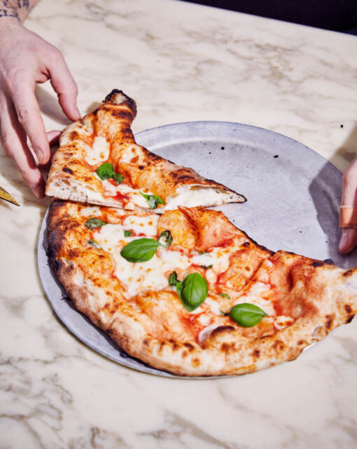 Rol je pizzadeeg uit op een tafel met wat semola, waarbij je ook de randen meeneemt.