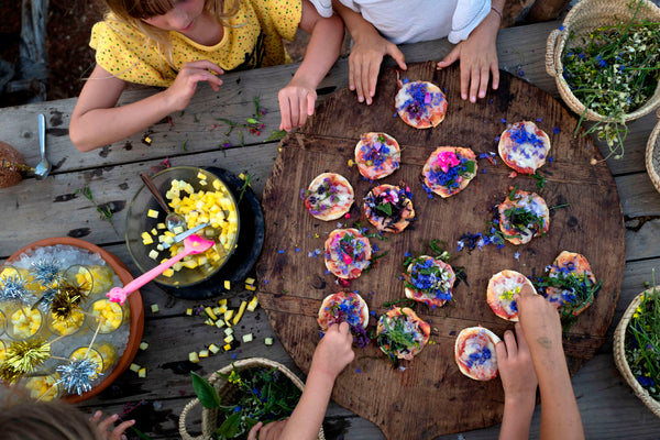 Pizza met tomaat, mozzarella en wilde bloemen
