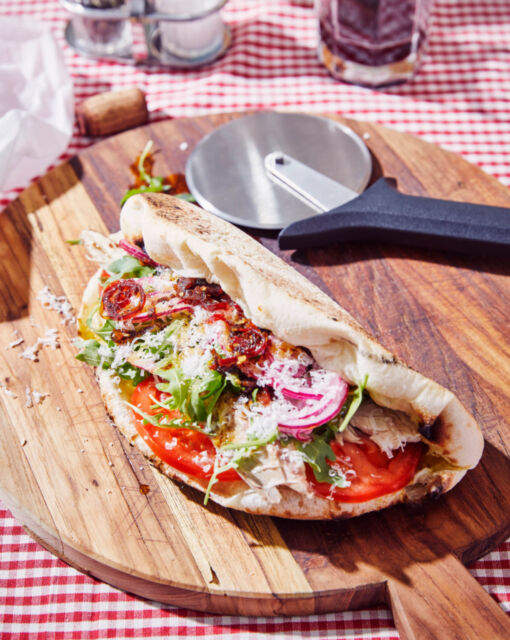 Sandwich vullen: Trek de pizza sandwich weer open en vul met de tomatenschijfjes, makreelstukken, rucola, gepekelde ui en Parmezaanse kaas. Werk af met chiliolie.