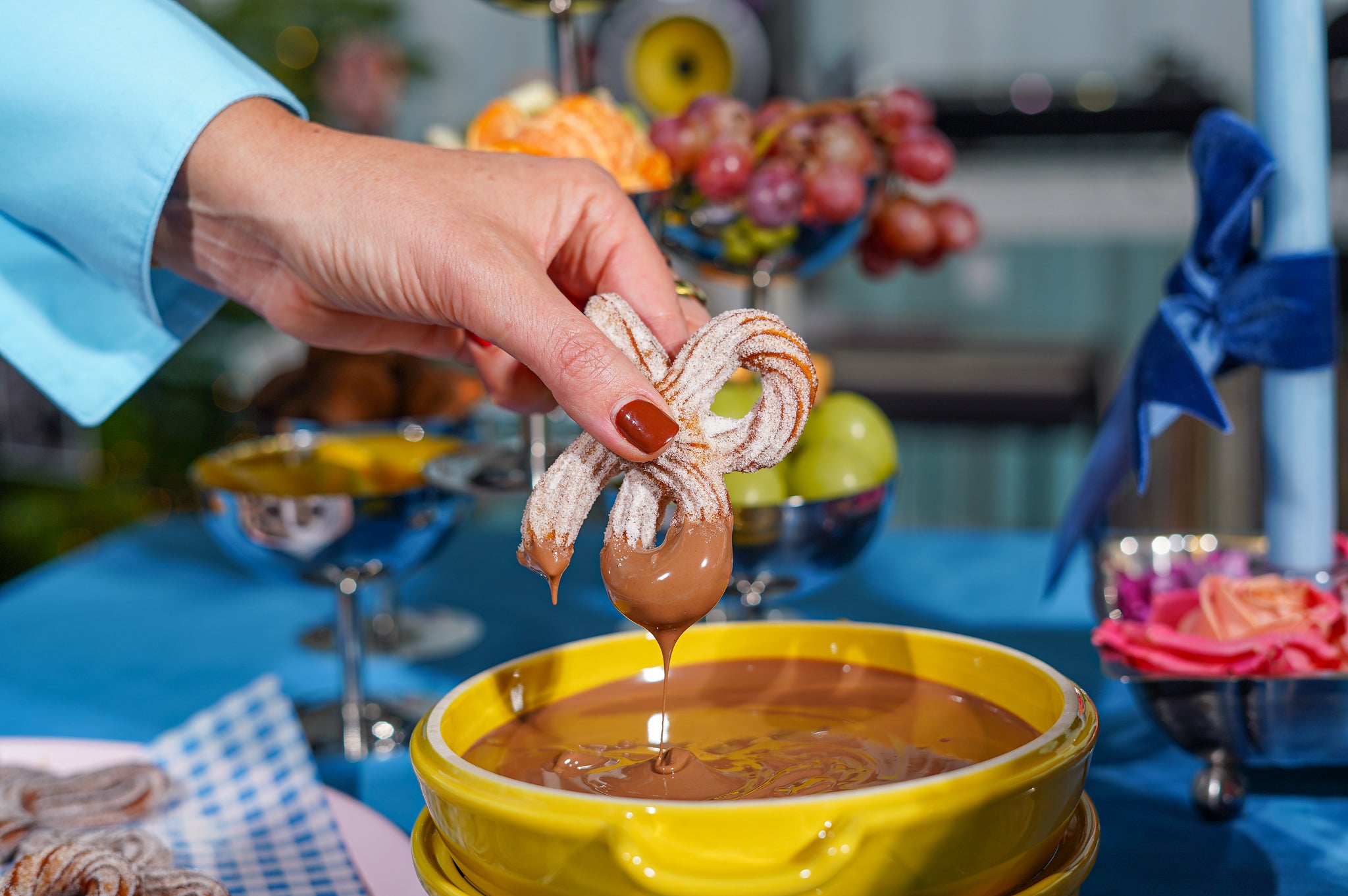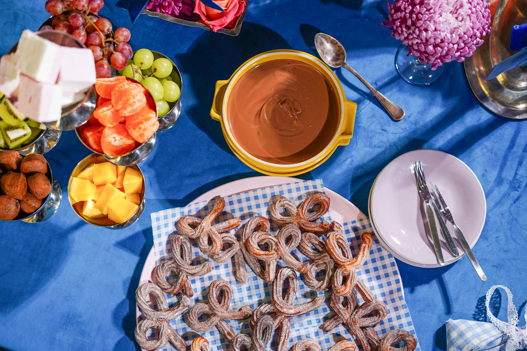 Serveren: Leg de churros, fruit, marshmallows, cakeblokjes en de warme chocolade samen op een mooie schaal of diptafel. Dippen maar!