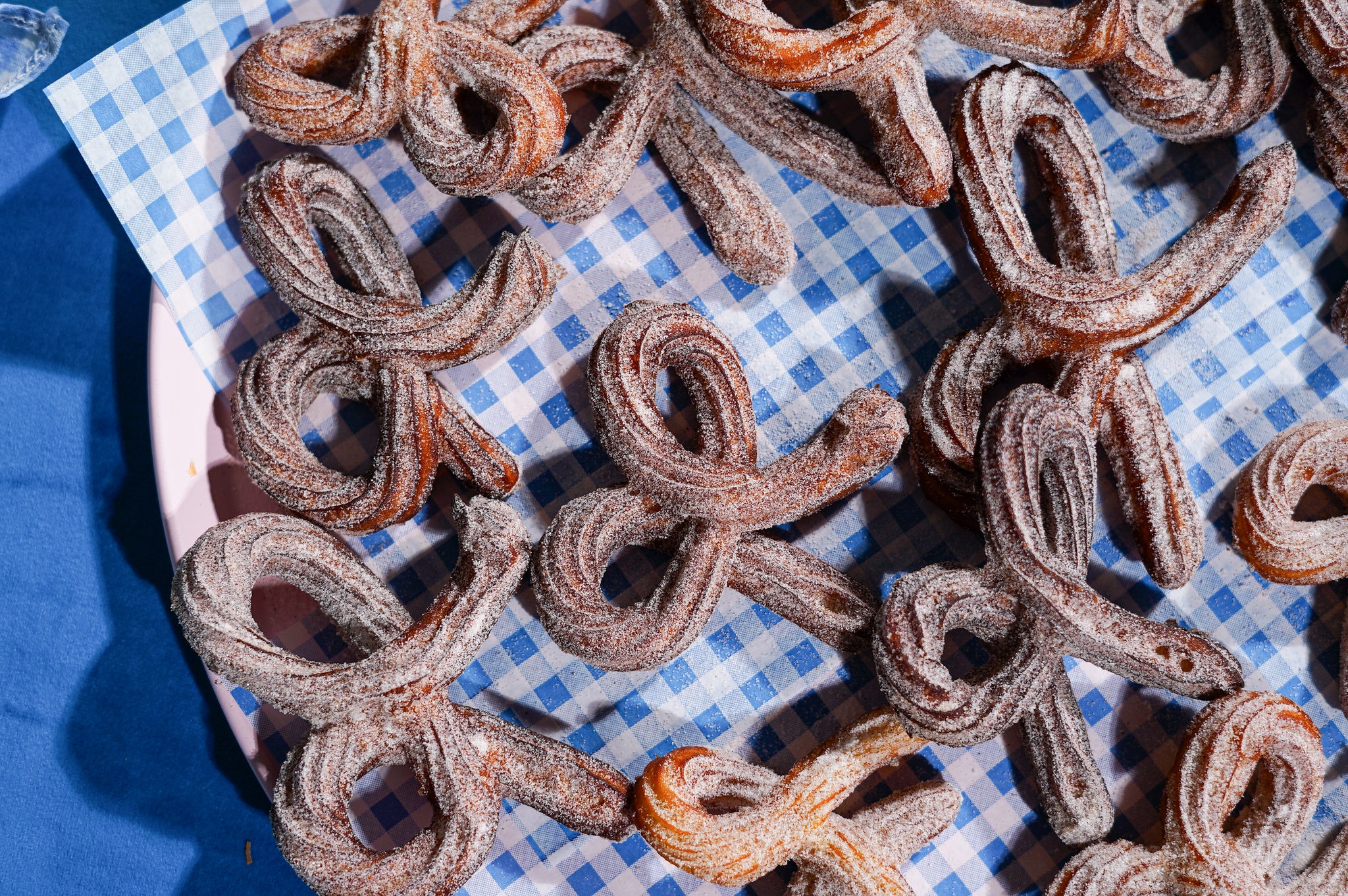 Knip rond de churros/strikjes en laat ze mét het bakpapier in de olie vallen. Het papier laat na enkele seconden vanzelf los — verwijder met een tang.