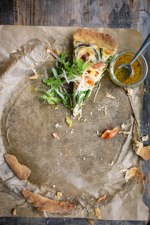 Leg een vel bakpapier in een bakvorm en leg het deeg erin. Leg een tweede vel bakpapier op het deeg en bedek de bodem met droge bonen, rijst of linzen. Bak de quichebodem nu ongeveer 30 minuten in de oven tot hij mooi krokant is.