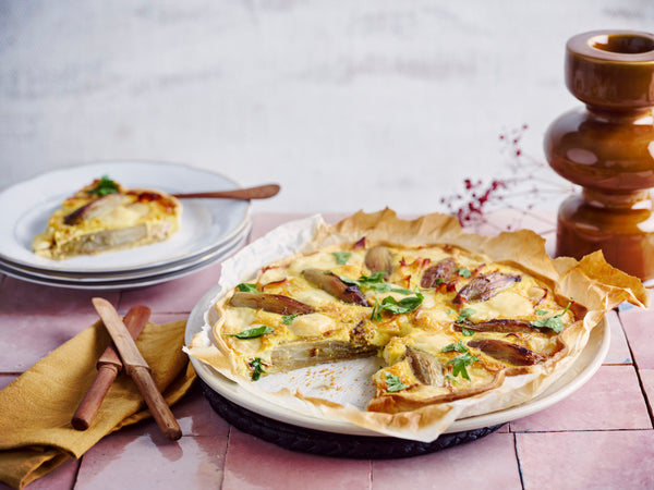 Trek de hesp in reepjes en vul hiermee de deegvorm, schik hierop het gebakken witloof.