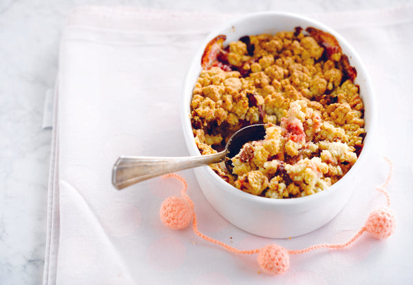 Zet de schotel in een grotere pot of op een plaat: crumble loopt snel over. Op die manier vermijd je dat de hele oven smerig wordt.