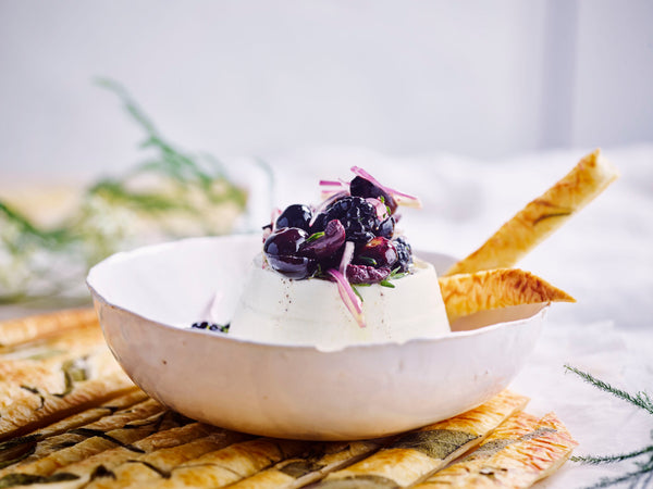 Ricotta dip met bessen en olijf, salie-rozemarijn sticks