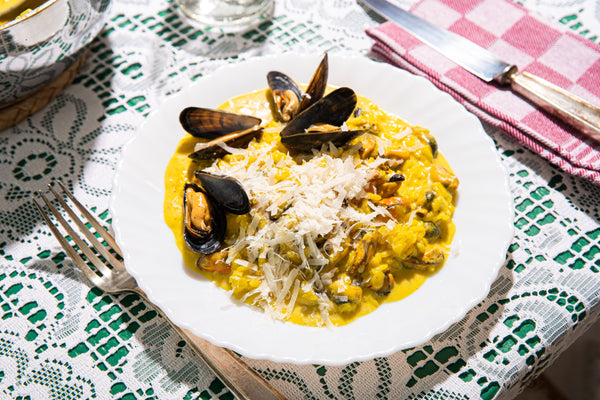 Roer er de mascarpone en Parmezaan onder en eventueel nog een extra klontje boter, proef en kruid eventueel bij. Serveer in diepe borden, werk af met een paar mosselen en extra geraspte Parmezaanse kaas. Heb je graag meer pit in je risotto, maak er dan op voorhand mijn crispy oil bij.