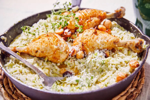 Serveer de risotto met de kippenbouten, macadamianoten en tijm. Werk af met extra geraspte pecorino.