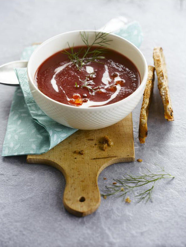 Schil de rode biet en snij ook deze in grove stukken. Maak je snijplank nat, zodat het sap van de rode biet niet in de plank kan dringen. Haal de soepkip uit het water als ze gaar is en verwijder ook de tijm en laurier. Voeg er nu de stukken rode biet aan toe en laat mee gaar koken. Kruid met het tomatenconcentraat en geraspte nootmuskaat en mix de soep fijn.