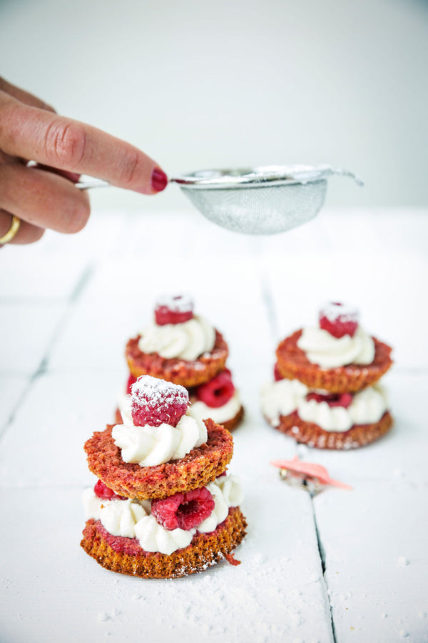 Snijd elke cupcake in tweeën. Spuit slagroom op de onderste helft, leg er enkele frambozen op en bedek met de bovenste helft. Werk af met slagroom, een framboos en eventueel bloemsuiker.