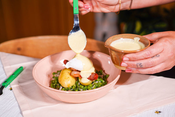 Werk af met een lepel picklescrème en eventueel een takje peterselie.