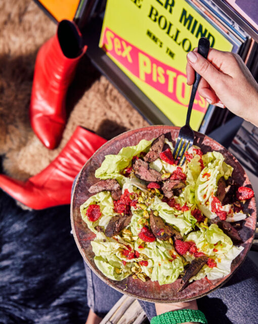 Verdeel de levertjes over de sla. Giet het vet weg en blus de pan met frambozenazijn en geplette frambozen.