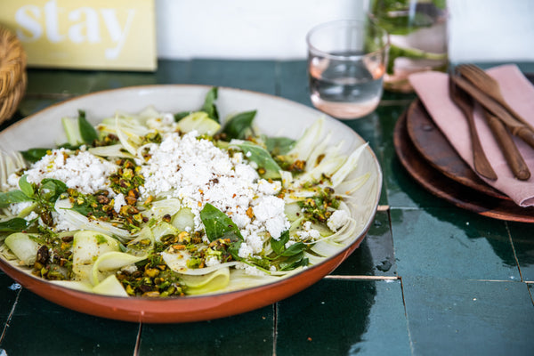 Doe de venkel en meloen in een mooie grote schaal, dresseer er de ricotta en basilicum bij.