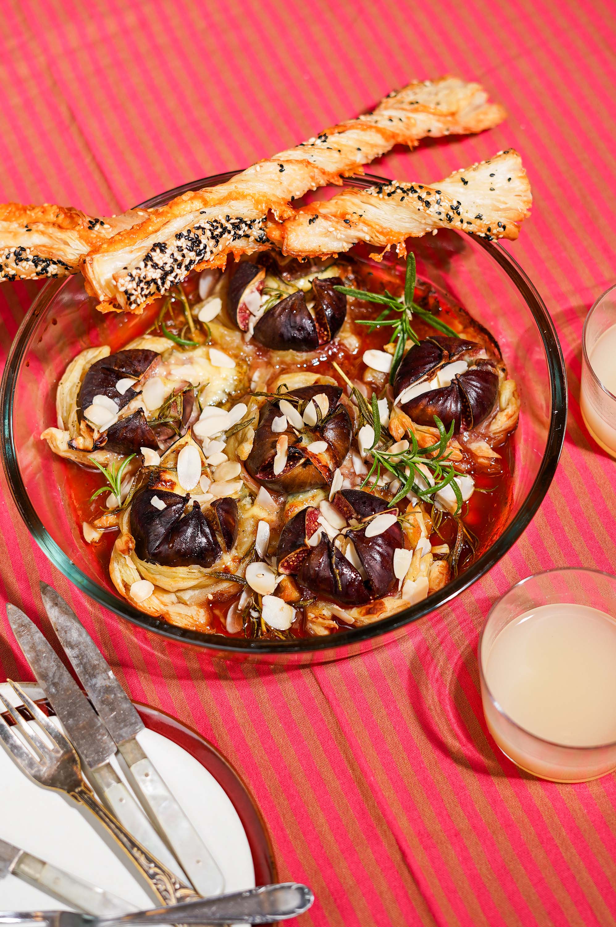 Besprenkel de vijgen met olijfolie en een handje amandelschilfers.