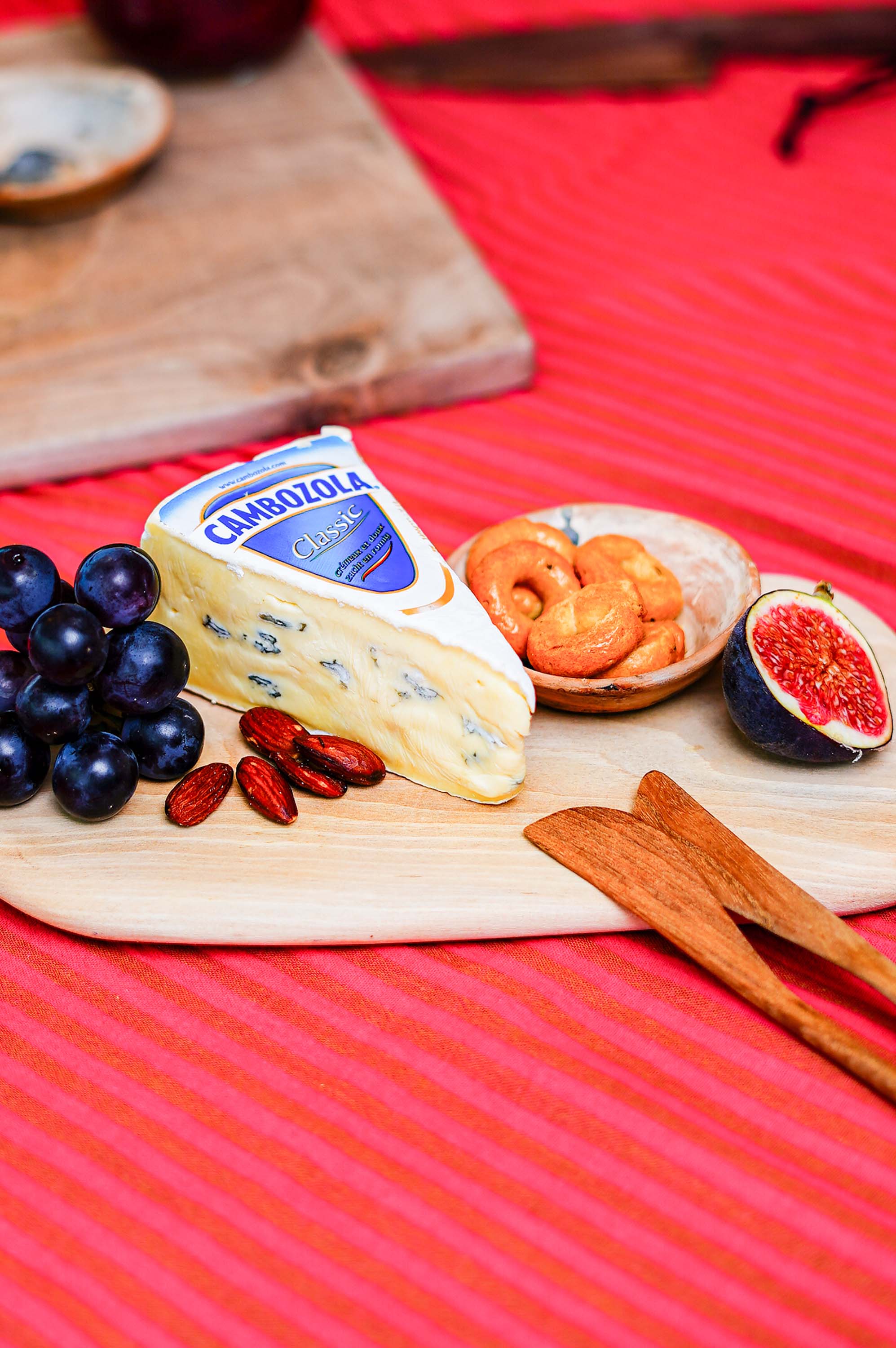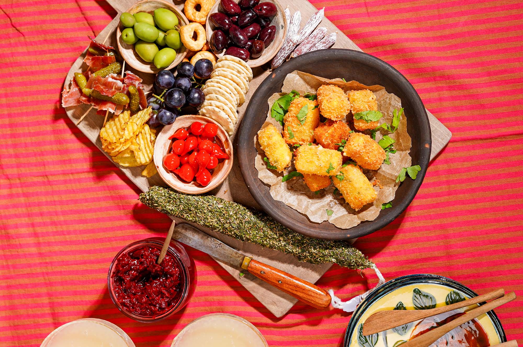 Werk je plank af met noten, olijfjes, druifjes, crackers en augurkjes met hesp.