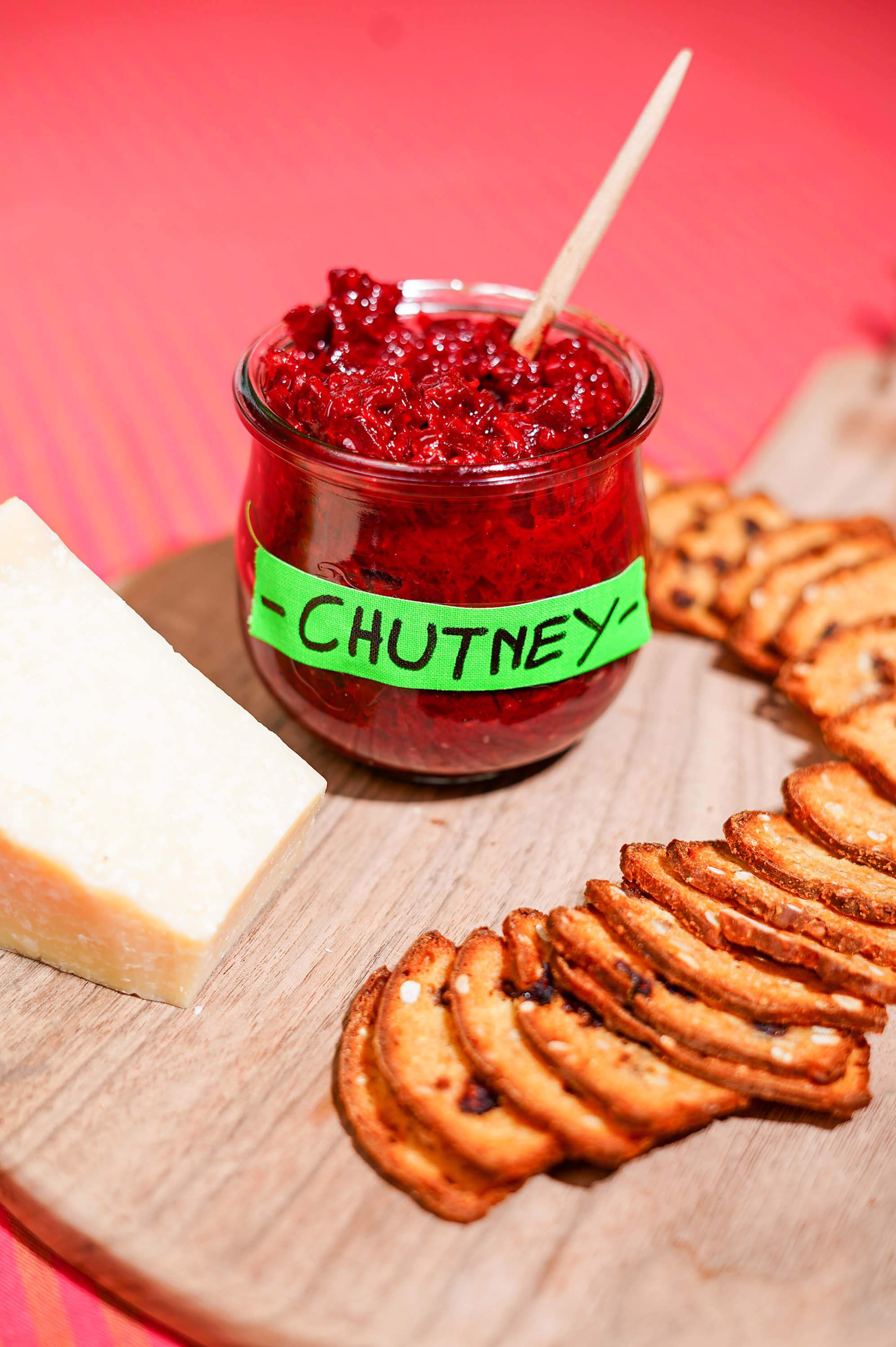 Verdeel de cambozola kroketjes erbij en garneer met blaadjes peterselie/bieslook. Leg daarbij een kommetje met de rode bietchutney.