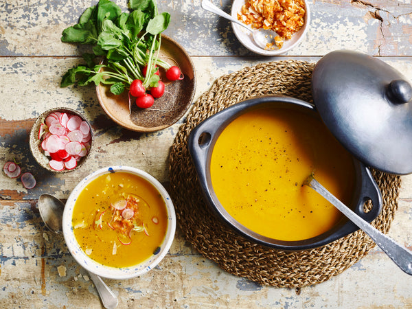 Soep geroosterde gele paprika en wortel, pesto van zongedroogde tomaten