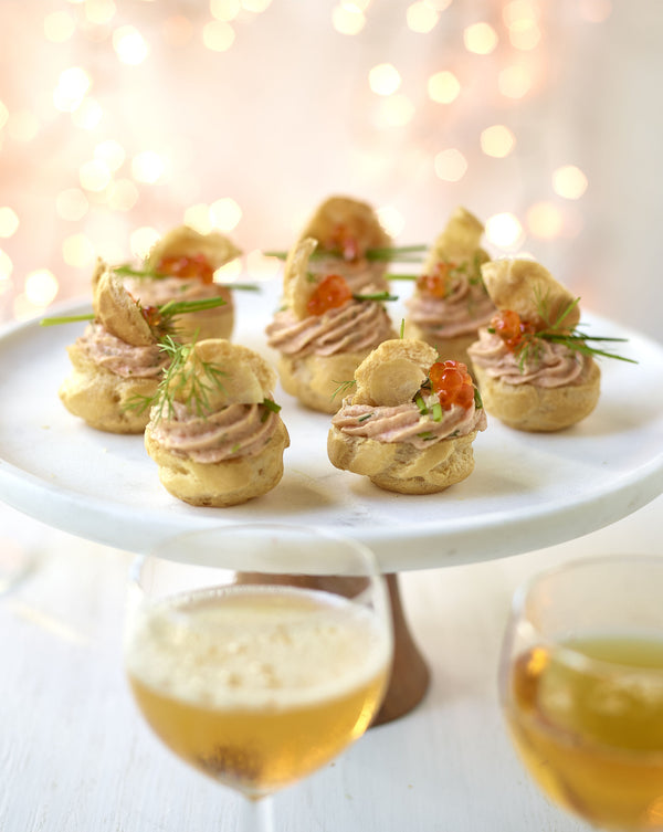 Open de soesjes en vul ze met mousse. Druk er lichtjes de verticaal afgesneden dekseltjes op. Werk af met zalmeitjes, bieslook en dille. Dien koel op.
