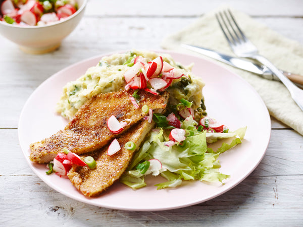 Stamppot van andijvie met kippen- of groenteschnitzels en radijzensalsa