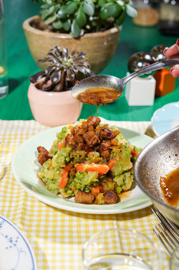 Serveren: Schep de stamppot op de borden, maak een kuiltje in het midden en lepel de ajuin-chipolatasaus erin. Werk af met een lik mosterd of wat pickles voor extra pit.