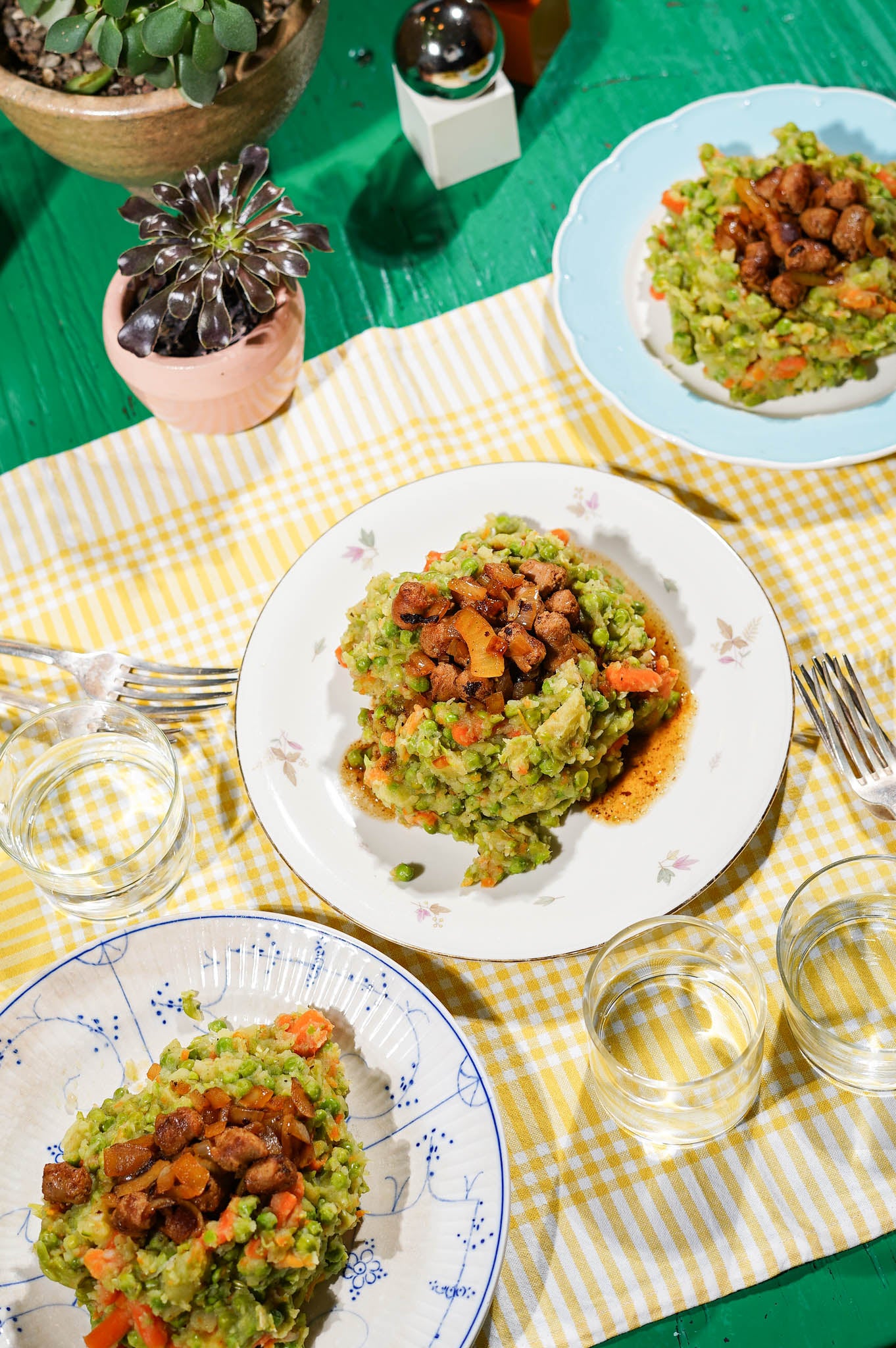 Groenten voorbereiden: Snipper de sjalot fijn en fruit deze in een eetlepel olie of boter tot hij glazig en licht gekaramelliseerd is. Voeg de ontdooide erwten en wortelen toe en bak een paar minuten mee. Plet grof met een pureestamper. Laat gerust wat structuur over voor extra beet.