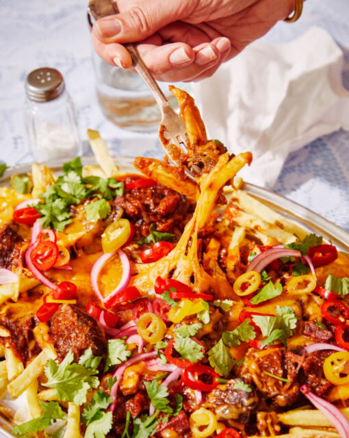 Stoofvlees met chorizo, verse frietjes, cheddar en jalapeño