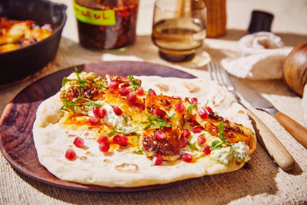 Besmeer de wrap royaal met tzatziki. Leg daar de gekaramelliseerde Halloumi op en wat saus van in de pan. 3. Werk af met granaatappelpitjes en extra muntblaadjes.