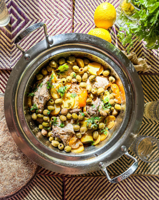Serveer de tajine warm met Marokkaans platbrood en een glas verfrissende muntthee.