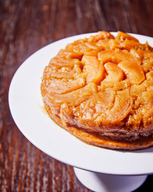 Laat lichtjes afkoelen, zet een platte schaal op de taart en draai om.