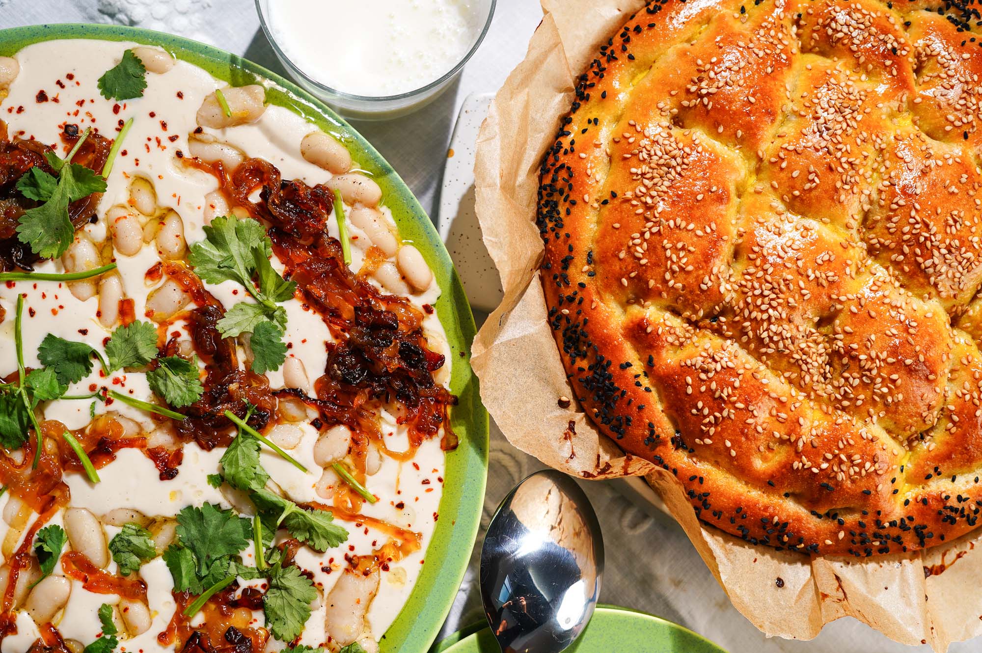 Een heerlijk luchtig Turks brood gecombineerd met een romige cannellini-bonen dip: perfect als hapje bij de apero of als licht gerecht bij de lunch. De zachte structuur van het brood met de crunch van sesam en nigellazaad vormt een ideale combo met de frisse, smeuïge dip van witte bonen, tahin en citroen. Afgewerkt met gekarameliseerde ui en een koriander, wordt dit gegarandeerd een nieuwe favoriet op tafel.