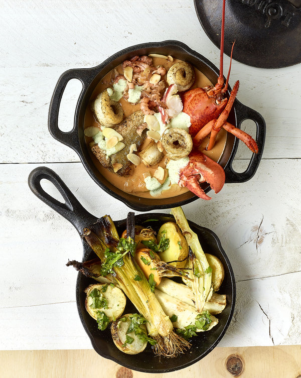 Verwarm de groenten en de vis net voor het opdienen 5 min in de oven (voorverwarmd op 195°C). Verdeel de vis over de pannetjes, voeg de stukken kreeft toe en overgiet met de hete kreeftensaus. Werk af met de grijze garnalen, de kruidenroom en de amandelen. Besprenkel de groenten met dressing en dien op.