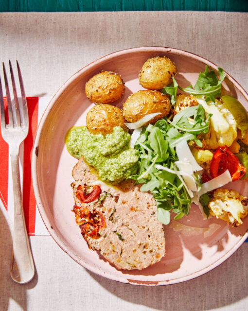 Serveer het vleesbrood in plakken met de krieltjes en de gegrilde groenten. Voeg een lepel basilicumpesto, wat rucola en parmezaanschilfers toe als garnituur.