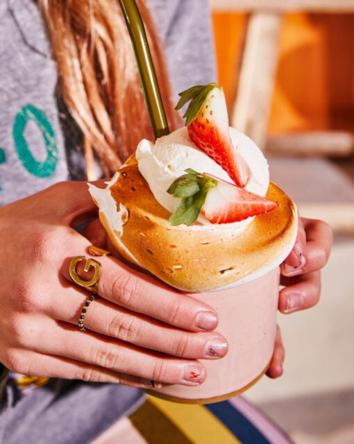 Voor de marshmallow fluff, doe het eiwit en de fijne suiker in een keukenrobot. Meng eerst even kort onder elkaar en klop vervolgens ongeveer 5-8 minuten op hoge snelheid tot een stevige massa. Spuit een dikke rand marshmallow fluff op de rand van je kopjes en karameliseer licht met een bunsenbrander.